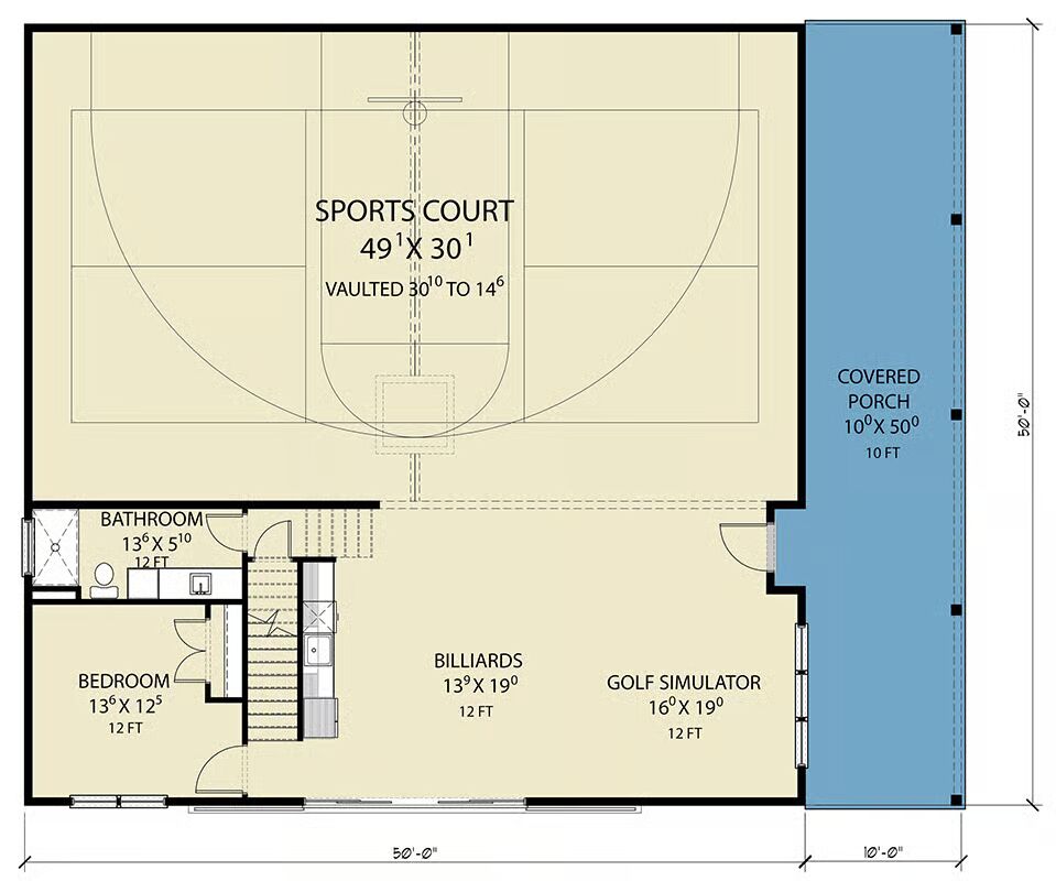Buy This PlanThe striking, dark Barndominium-style façade features massive sliding barn doors and a second-story window framed in natural wood.The grand side elevation showcases the vertical metal siding, the loft window, and an adjacent parking area with a sleek modern vehicle.A rear-side view highlights the clean lines of the structure and the simple, functional elegance of the modern barn design.A deep, shaded porch with rustic wood posts provides a welcoming outdoor living space along the side of the home.A covered porch extends along the side of the home, offering an inviting, sheltered transition between the interior and the lush outdoors.A multi-functional open space includes a kitchenette and a pool table, ready for entertaining and fun right next to the indoor court.Natural light floods the entertainment zone, centered by a stylish pool table and featuring a light-wood kitchenette.The master bedroom achieves dramatic flair with dark walls and a stunning wood-plank accent wall behind the bed.This cozy living area features dark, moody walls, plush seating, and unique wooden geometric wall art for a modern-rustic feel.The luxurious bathroom combines warm wood cabinetry with bright, modern marble-look tile in the walk-in shower.An upstairs loft space provides a comfortable, tucked-away media or reading nook with a vaulted ceiling.This ultimate recreation area features a large golf simulator, a pool table, and an adjacent kitchenette.An incredible full-size indoor court with hardwood flooring provides an active-lifestyle amenity right inside the home.The impressive golf simulator screen transforms a section of the recreation room into a dedicated practice green.