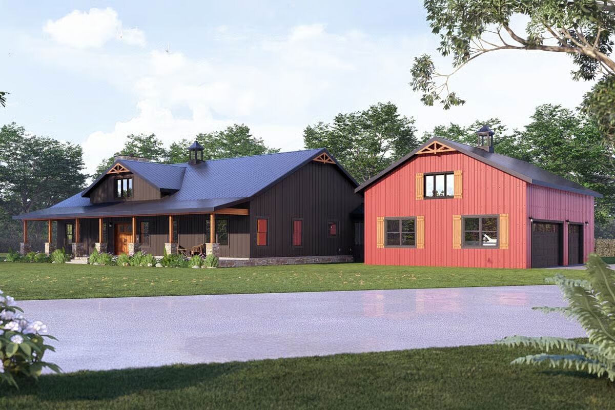Embrace modern farmhouse charm in this striking 2,487 sq. ft. Barndominium-style home, featuring 3 bedrooms, 2.5 bathrooms, and an impressive 1,197 sq. ft. detached 2-car garage wrapped in classic board-and-batten and vertical siding.
