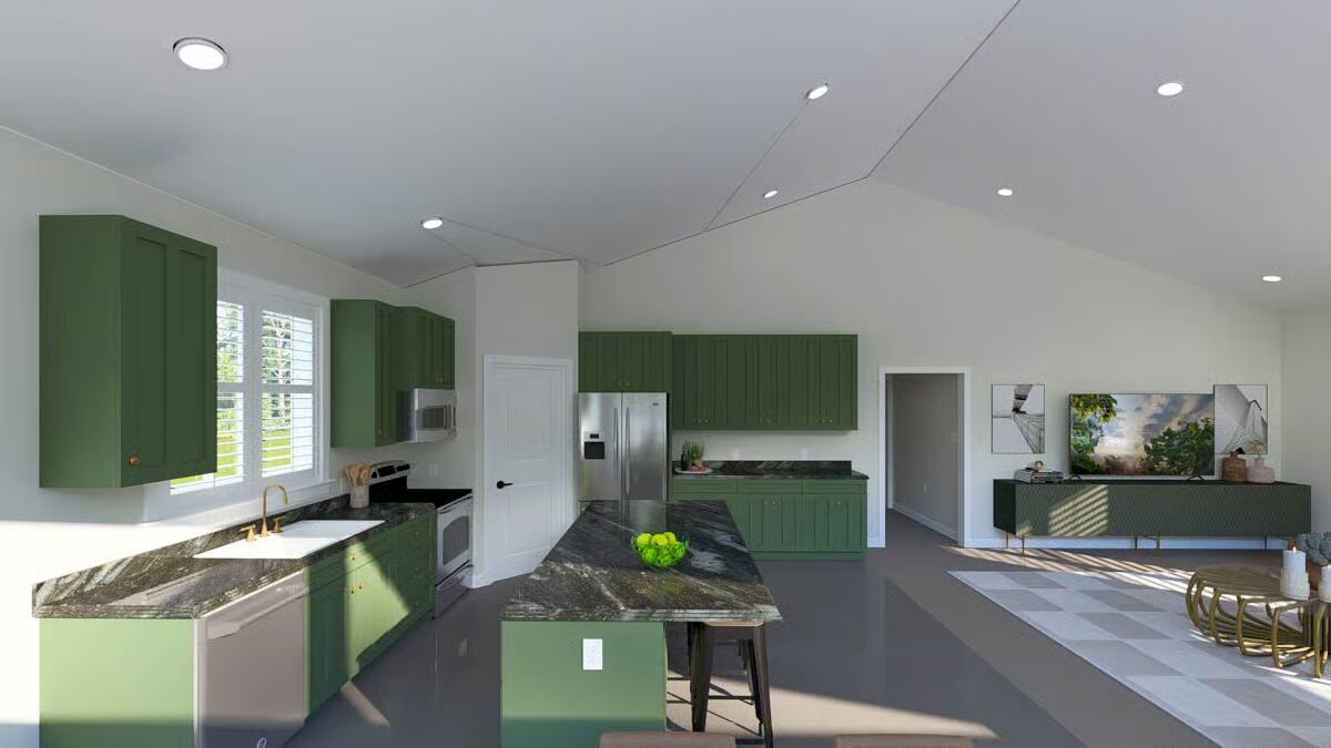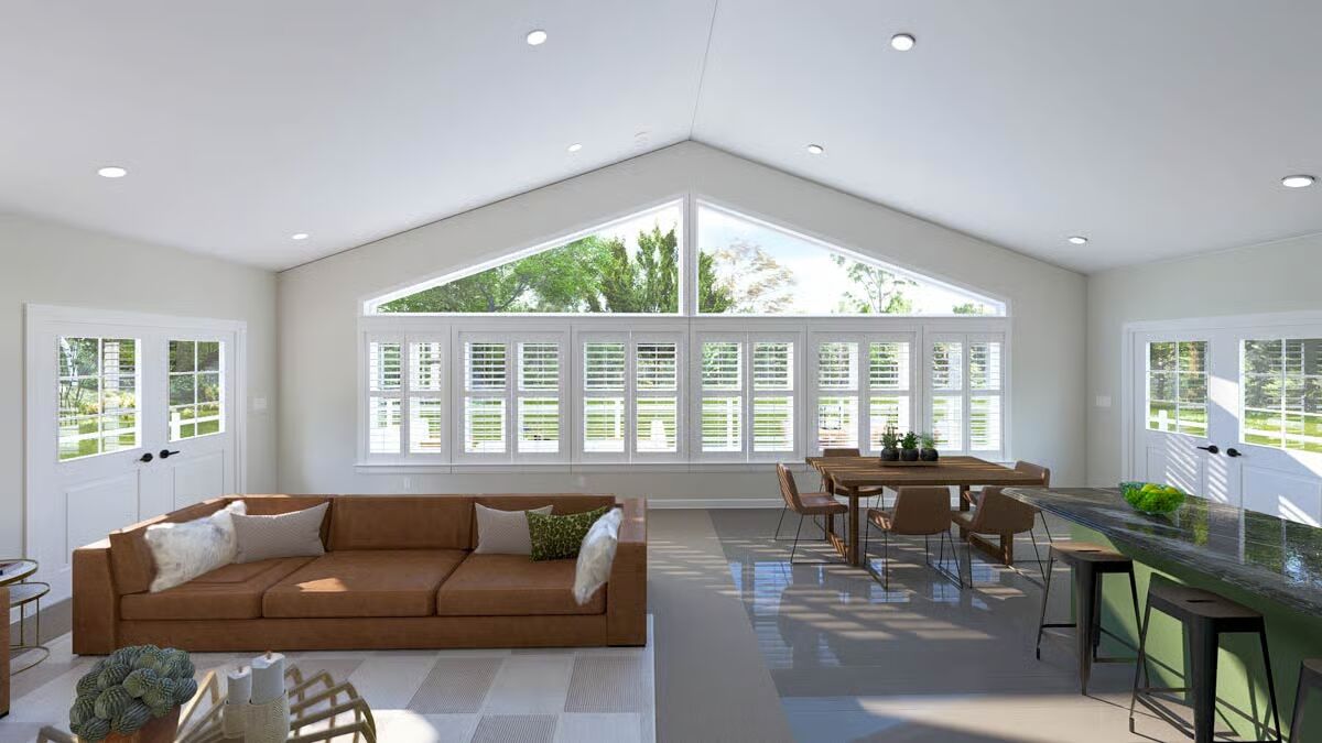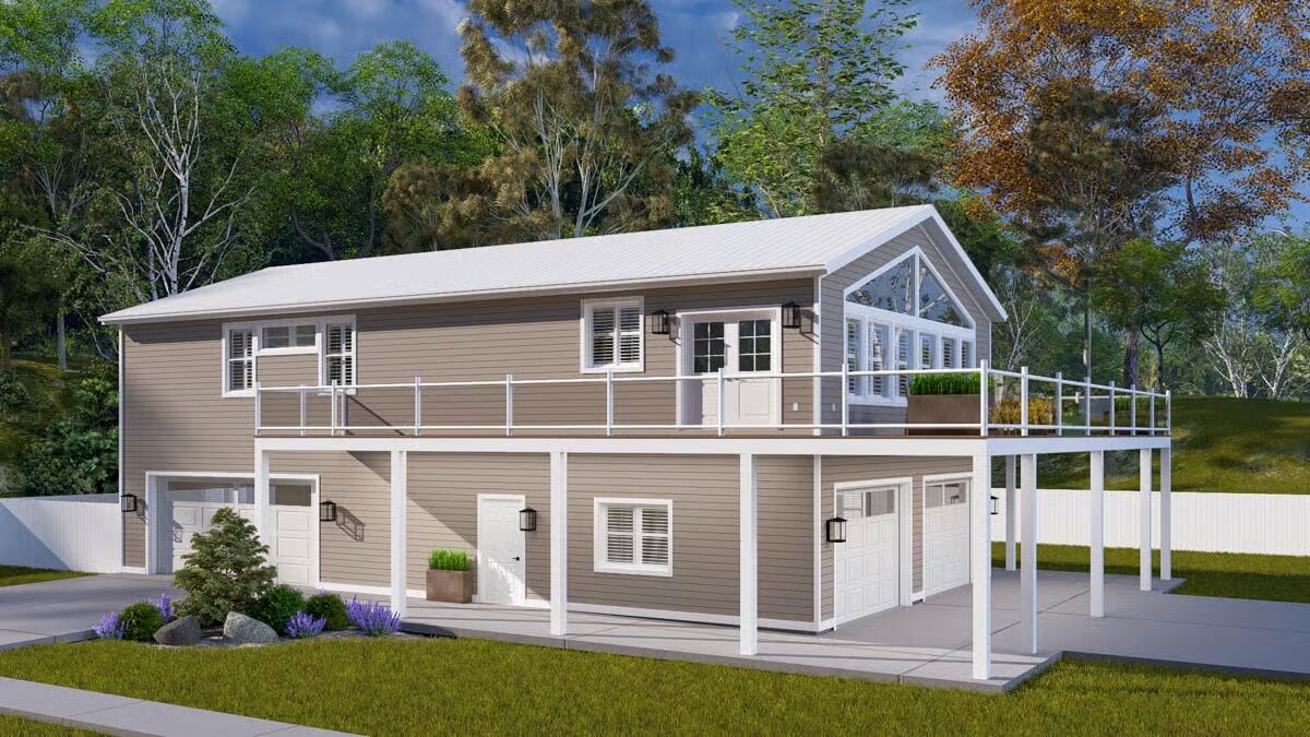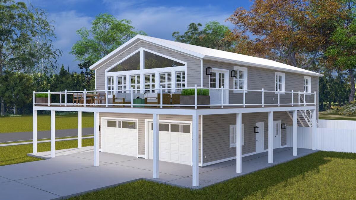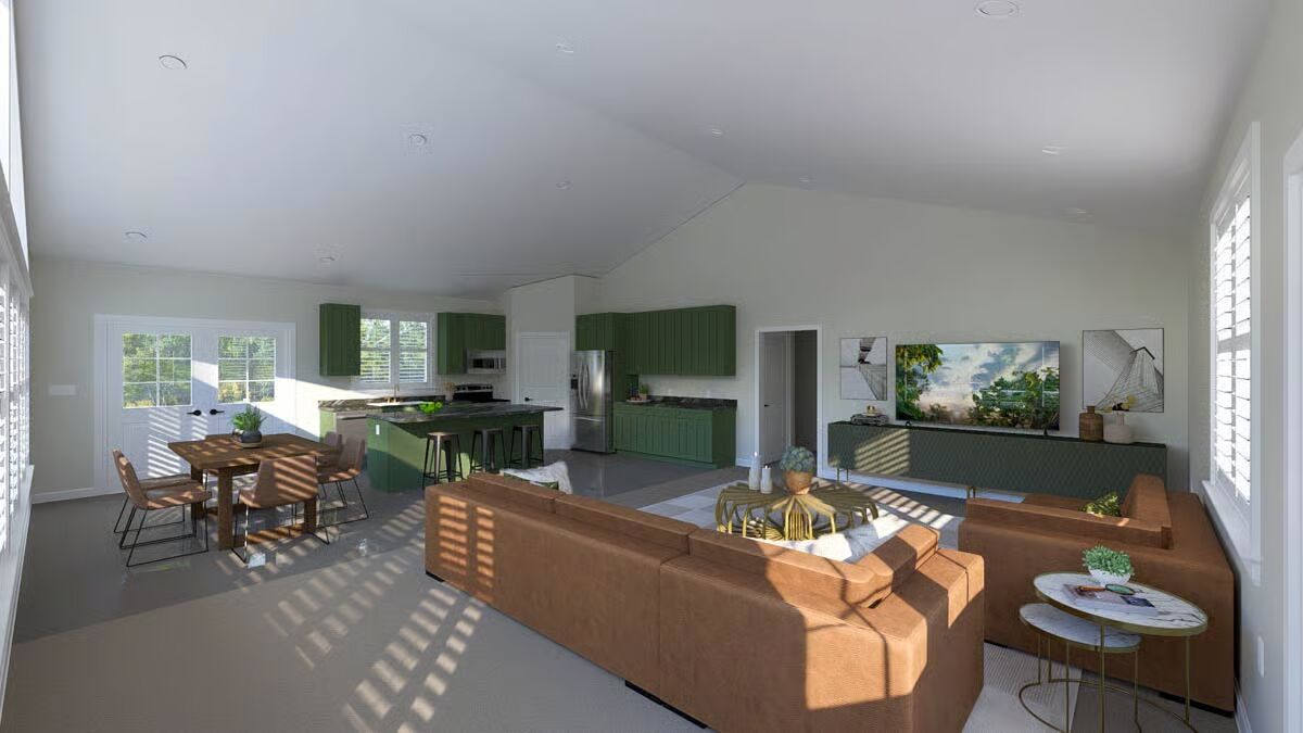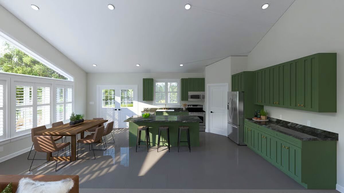 A welcoming front elevation featuring an attached oversized garage and a covered patio area below the deck.A lovely front angle showcasing the elevated living area, wrap-around deck, and convenient ground-level entrances.The front view highlights the classic metal roof, a wide second-level deck, and striking garage doors beneath a massive triangular window.This impressive barndominium-style home features a prominent dual garage and a huge second-story deck perfect for outdoor entertaining.The backyard perspective reveals a secure fenced area and the essential staircase leading to the spacious upper deck.This side view emphasizes the home’s broad footprint, large lower-level garage, and private outdoor space with a fence.An overview of the open floor plan shows a seamless connection between the stylish green kitchen, dining space, and comfortable living area.The living room is cozy yet spacious, featuring a warm sectional sofa and a contemporary gold coffee table against a large white area rug.A grand view of the living and dining space, anchored by a comfortable brown sofa and a breathtaking, floor-to-ceiling triangular window.This bright, open space features the kitchen and dining area, drawing attention to the striking vaulted ceiling and large windows.The modern kitchen shines with bold hunter-green cabinetry and a contrasting dark granite island, all beneath a vaulted ceiling.