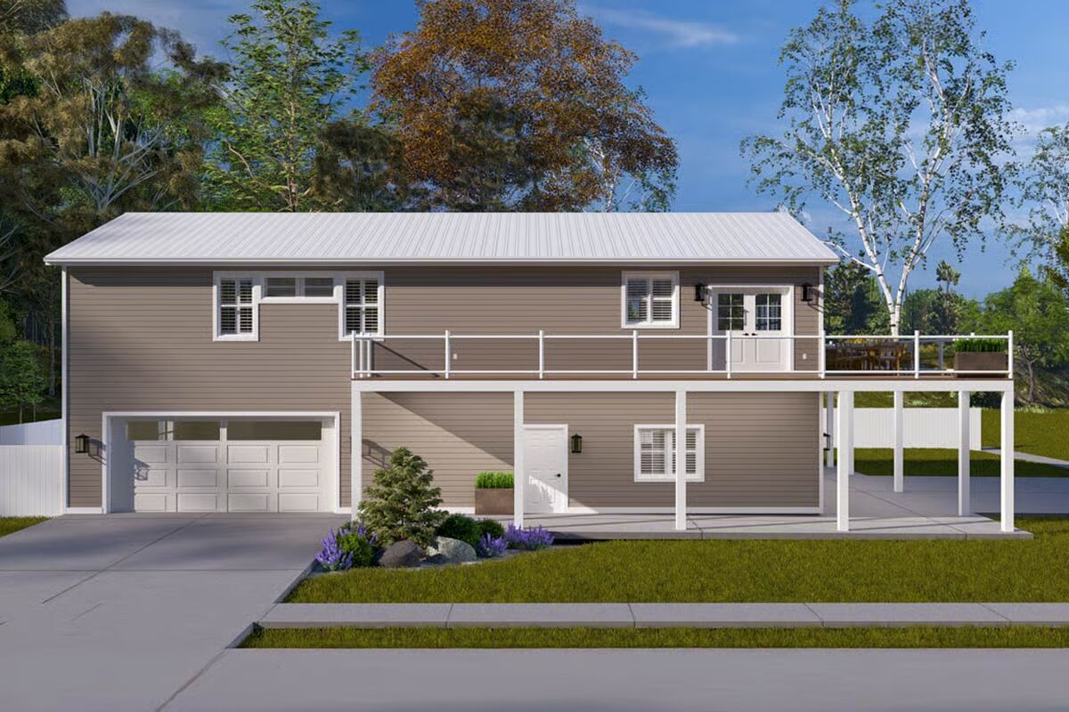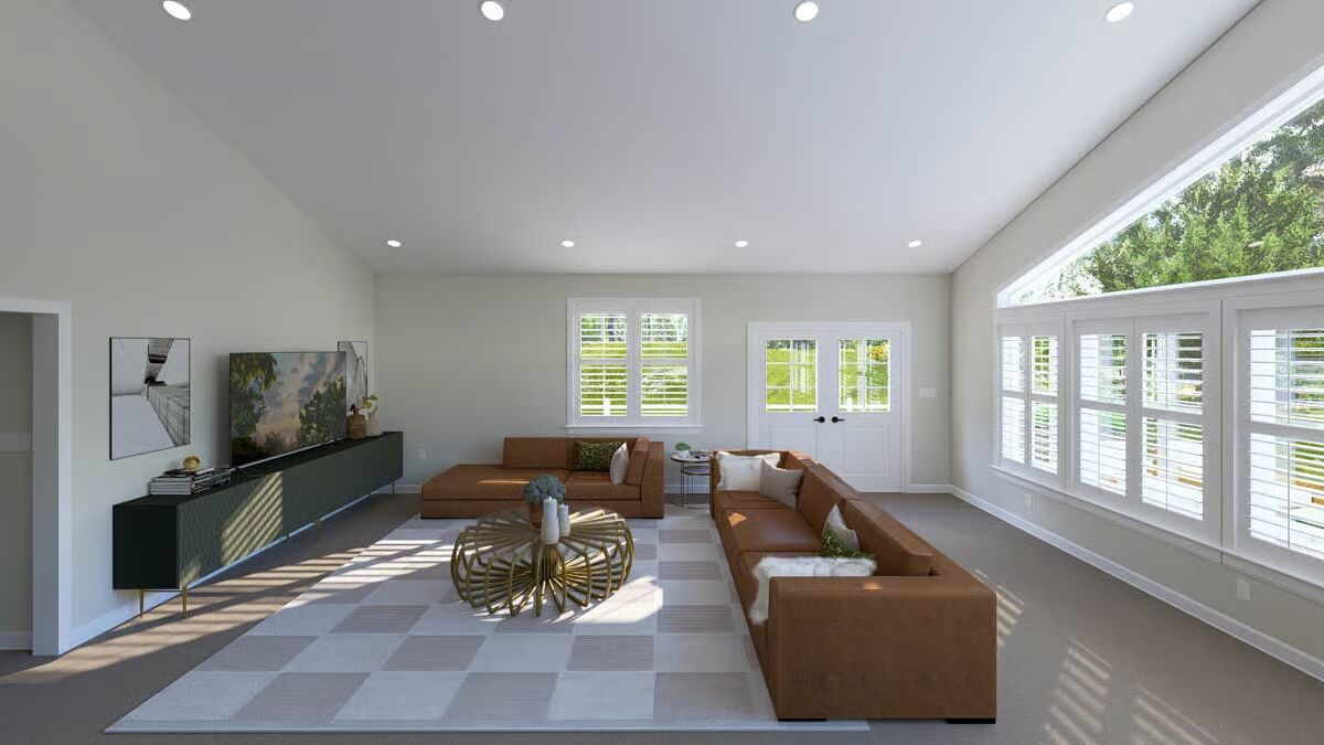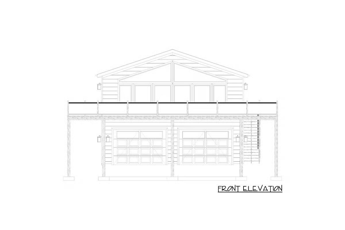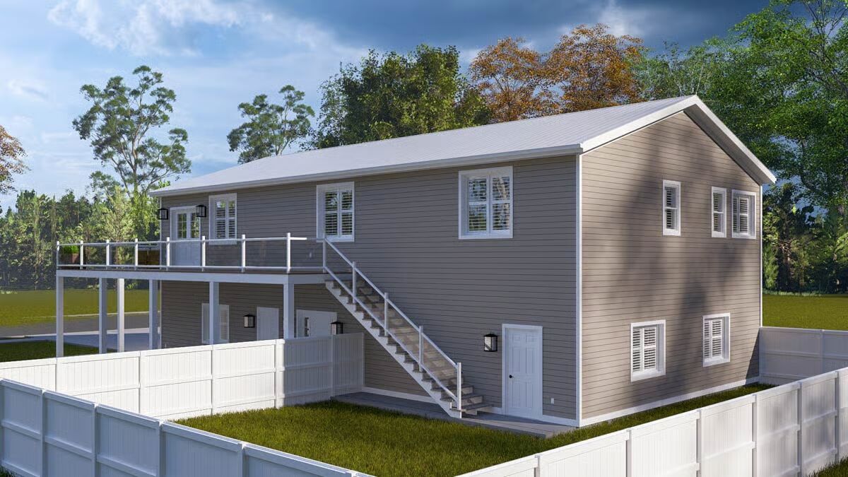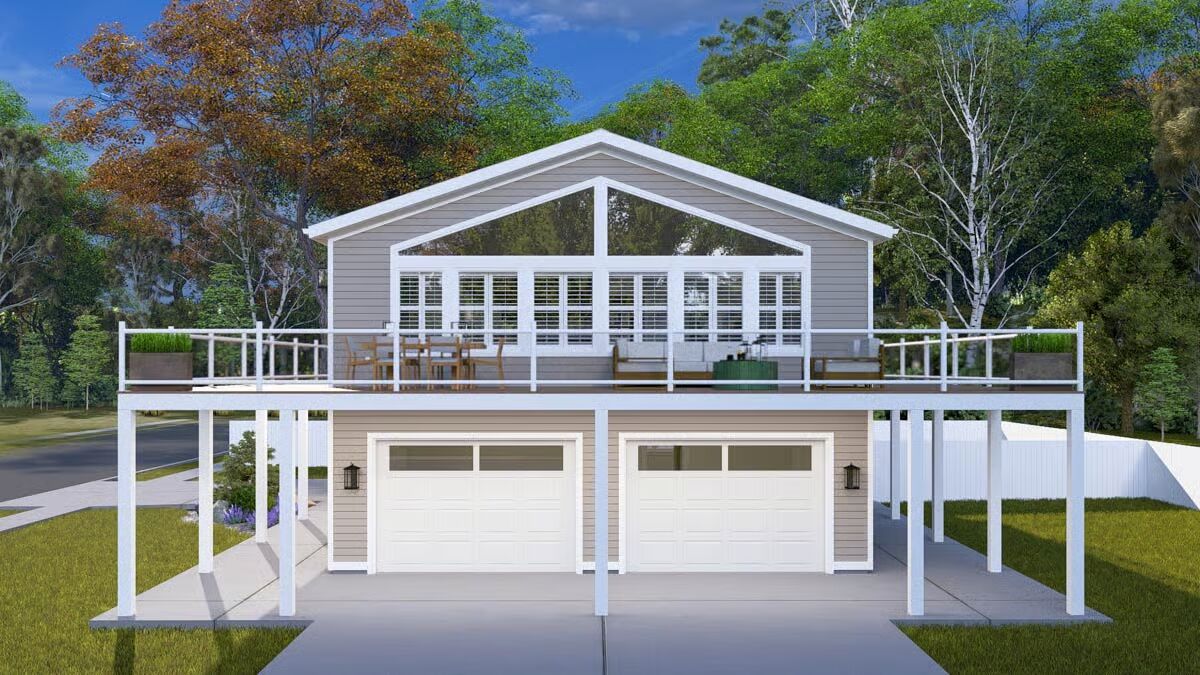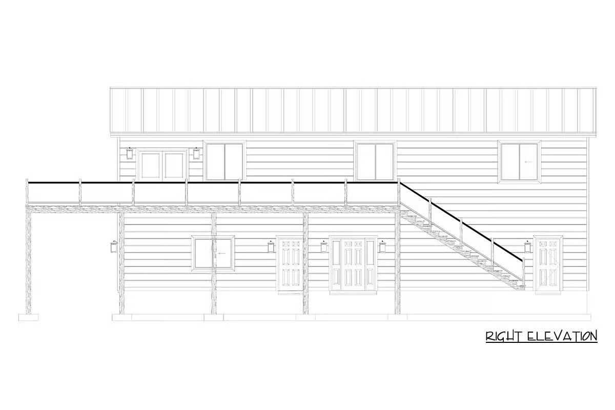 A welcoming front elevation featuring an attached oversized garage and a covered patio area below the deck.A lovely front angle showcasing the elevated living area, wrap-around deck, and convenient ground-level entrances.The front view highlights the classic metal roof, a wide second-level deck, and striking garage doors beneath a massive triangular window.This impressive barndominium-style home features a prominent dual garage and a huge second-story deck perfect for outdoor entertaining.The backyard perspective reveals a secure fenced area and the essential staircase leading to the spacious upper deck.This side view emphasizes the home’s broad footprint, large lower-level garage, and private outdoor space with a fence.An overview of the open floor plan shows a seamless connection between the stylish green kitchen, dining space, and comfortable living area.The living room is cozy yet spacious, featuring a warm sectional sofa and a contemporary gold coffee table against a large white area rug.A grand view of the living and dining space, anchored by a comfortable brown sofa and a breathtaking, floor-to-ceiling triangular window.This bright, open space features the kitchen and dining area, drawing attention to the striking vaulted ceiling and large windows.The modern kitchen shines with bold hunter-green cabinetry and a contrasting dark granite island, all beneath a vaulted ceiling.