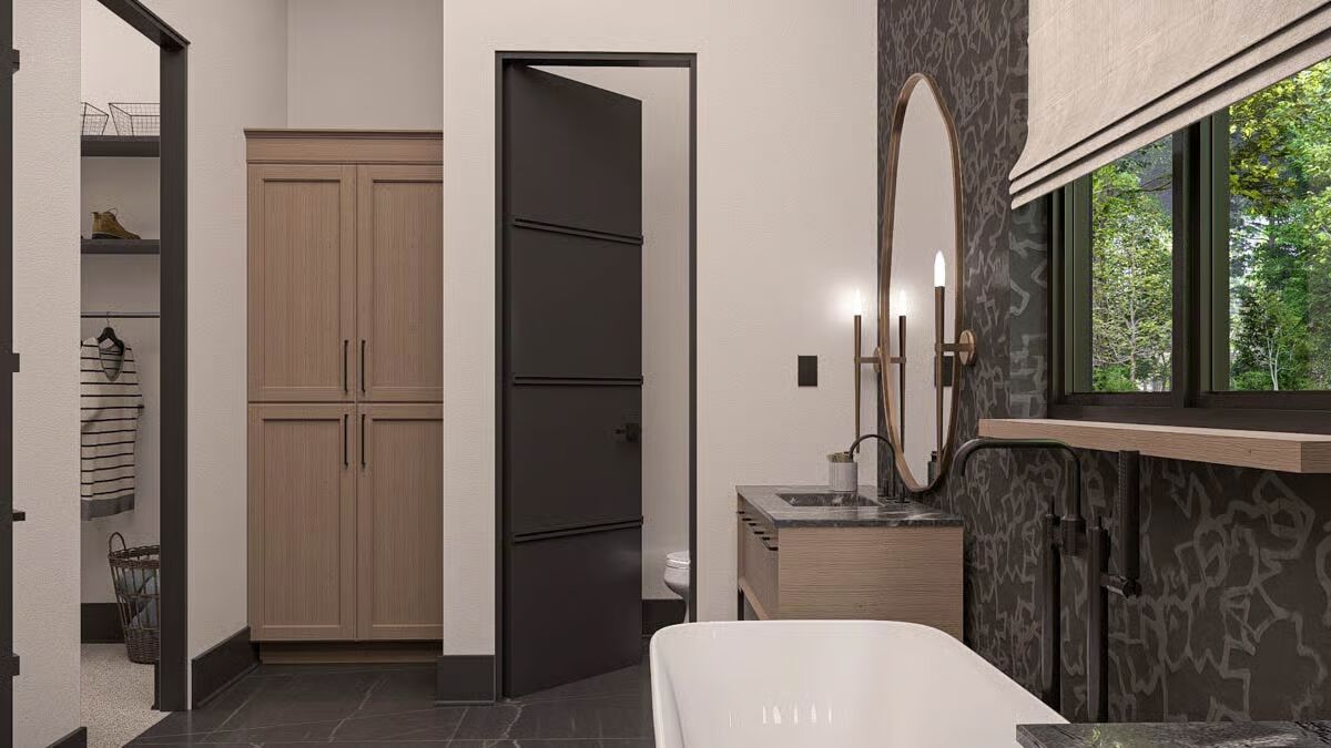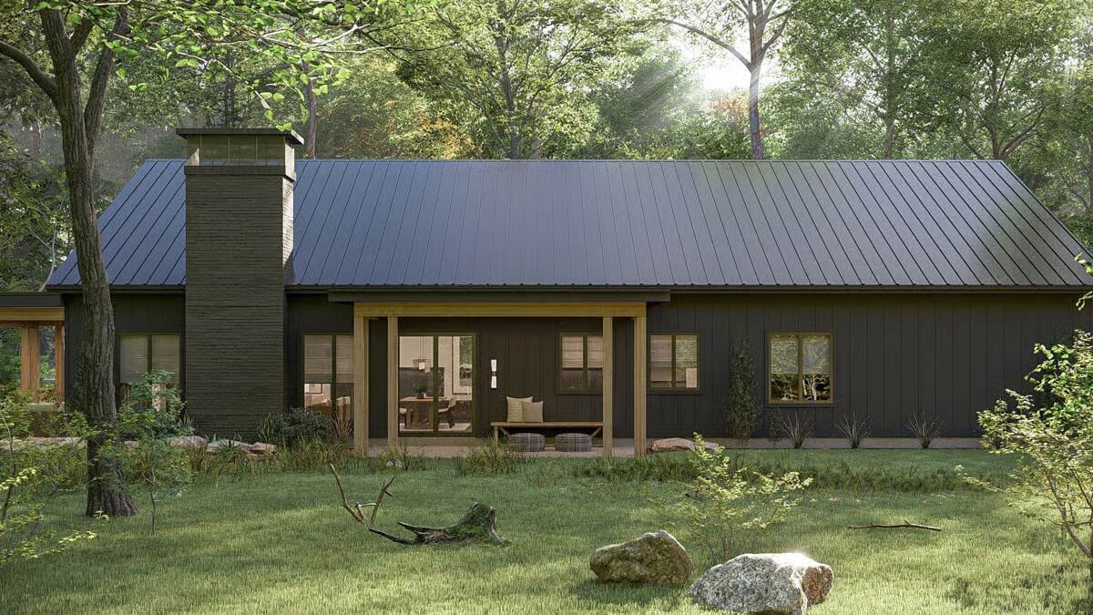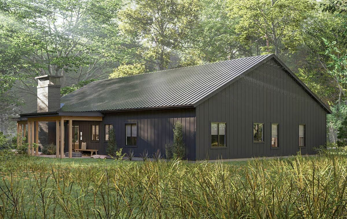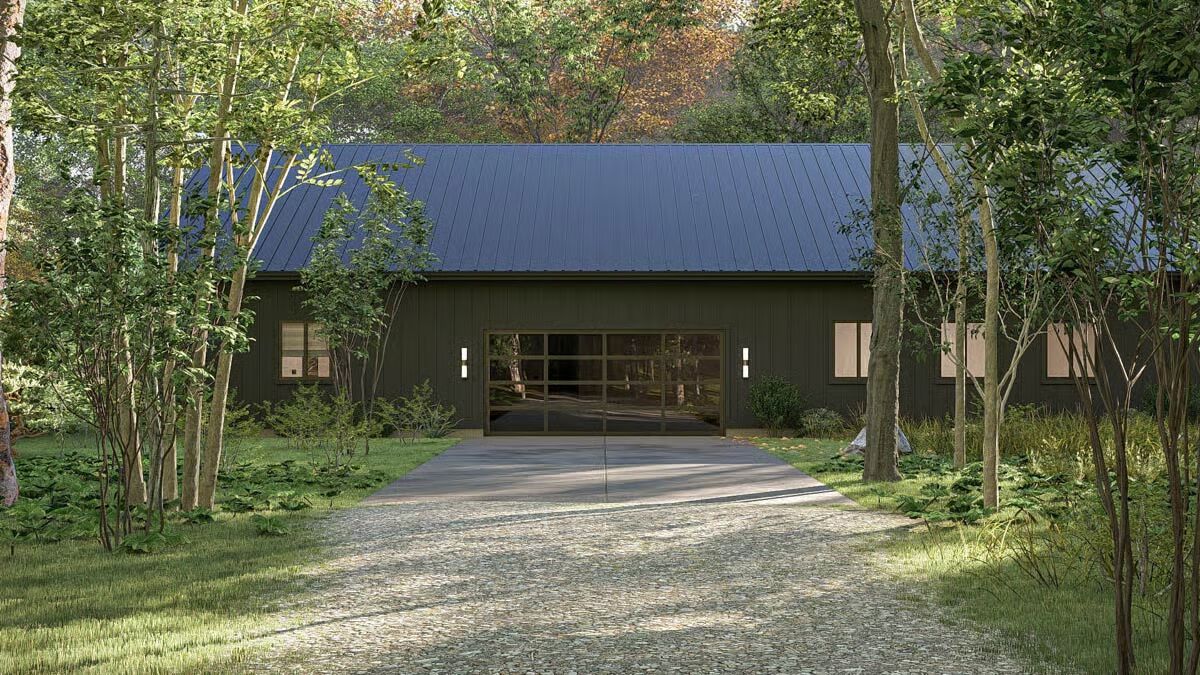 Buy This PlanThe dark siding and metal roof of this Barndominium stand in stark contrast to the surrounding greenery, creating a gorgeous woodland retreat.The grand glass garage door and inviting covered patio define the modern-rustic facade of this stunning Barndominium.A modern glass garage door on the forest-facing side provides a stunning, light-filled focal point for the utilitarian space.This long view captures the full scale of the Barndominium’s sleek profile, seamlessly connecting the living area to the lush natural surroundings.Wrapped in a charming porch and set amidst misty foliage, this dark Barndominium offers a perfect blend of mystery and modern style.This striking Barndominium features a low-profile metal roof and dark siding, creating a sleek, secluded forest retreat.The charcoal siding and metal roof of this rear exterior emphasize the strong, contemporary geometry of the Barndominium design.The dining area is beautifully integrated into the open-concept living space, offering an elegant spot for meals right off the main kitchen.Gather around the dramatic stone fireplace in this cozy living room, which opens to the outdoors through expansive glass doors.Warm wood cabinetry contrasts beautifully with the dark stone countertops in this stylish kitchen, promising both beauty and function for the home chef.This serene bedroom is a restful sanctuary, centered by a dark wood bed frame and flanked by twin windows dressed in layered drapes.Step into this luxurious spa-like bathroom, complete with a floating vanity, modern oval mirror, and a sleek, glass-enclosed walk-in shower.This master bathroom is a designer’s dream, featuring twin organic-shaped mirrors flanking a deep, freestanding soaking tub.The gourmet kitchen island anchors this sophisticated space, featuring sleek dark stone and contrasting wood-toned cabinets under modern drum pendants.Function meets finesse in this bathroom, which features an elegant soaking tub and provides access to a large walk-in closet with custom shelving.The mudroom offers stylish organization with a built-in bench, practical hooks, and a warm wood accent wall to welcome you home.