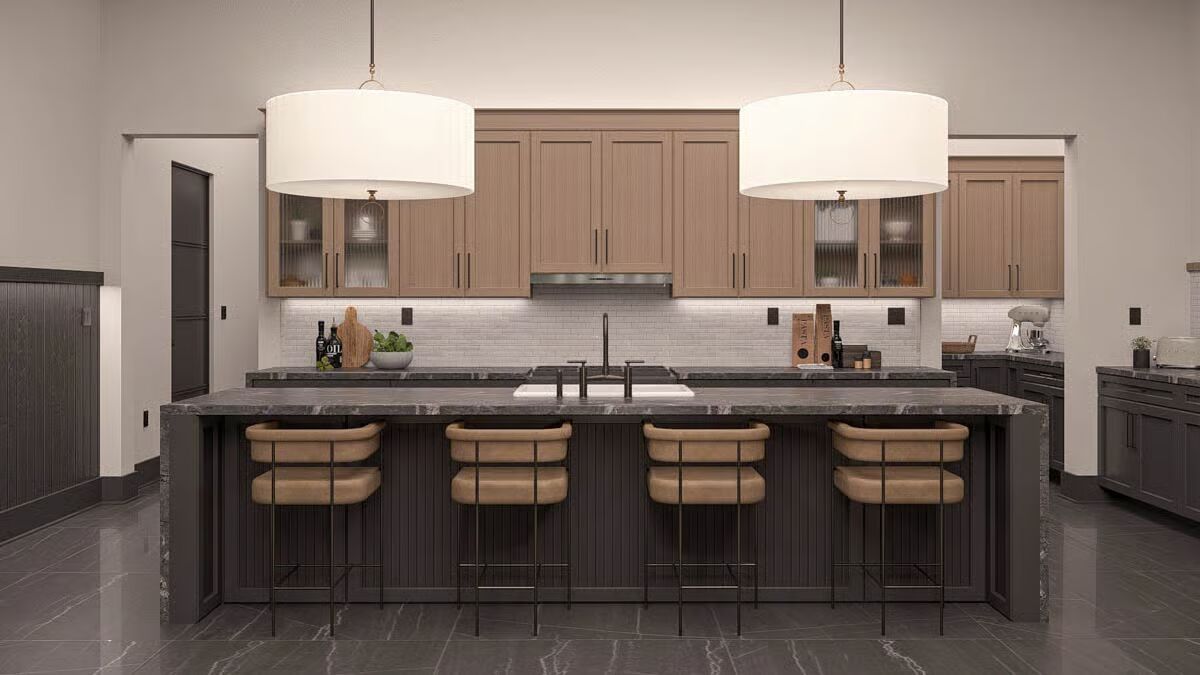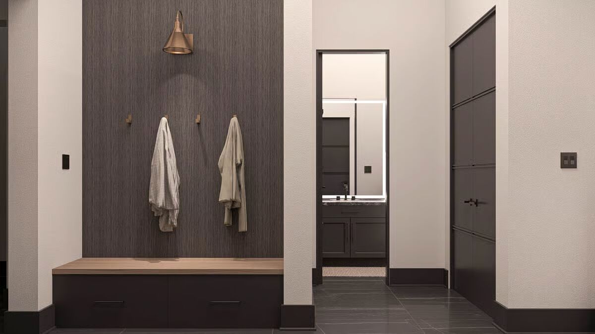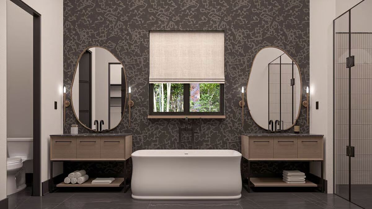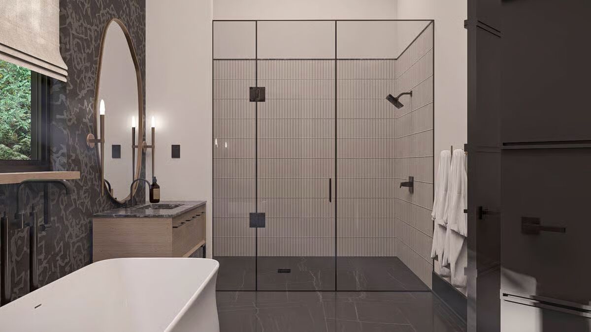 Buy This PlanThe dark siding and metal roof of this Barndominium stand in stark contrast to the surrounding greenery, creating a gorgeous woodland retreat.The grand glass garage door and inviting covered patio define the modern-rustic facade of this stunning Barndominium.A modern glass garage door on the forest-facing side provides a stunning, light-filled focal point for the utilitarian space.This long view captures the full scale of the Barndominium’s sleek profile, seamlessly connecting the living area to the lush natural surroundings.Wrapped in a charming porch and set amidst misty foliage, this dark Barndominium offers a perfect blend of mystery and modern style.This striking Barndominium features a low-profile metal roof and dark siding, creating a sleek, secluded forest retreat.The charcoal siding and metal roof of this rear exterior emphasize the strong, contemporary geometry of the Barndominium design.The dining area is beautifully integrated into the open-concept living space, offering an elegant spot for meals right off the main kitchen.Gather around the dramatic stone fireplace in this cozy living room, which opens to the outdoors through expansive glass doors.Warm wood cabinetry contrasts beautifully with the dark stone countertops in this stylish kitchen, promising both beauty and function for the home chef.This serene bedroom is a restful sanctuary, centered by a dark wood bed frame and flanked by twin windows dressed in layered drapes.Step into this luxurious spa-like bathroom, complete with a floating vanity, modern oval mirror, and a sleek, glass-enclosed walk-in shower.This master bathroom is a designer’s dream, featuring twin organic-shaped mirrors flanking a deep, freestanding soaking tub.The gourmet kitchen island anchors this sophisticated space, featuring sleek dark stone and contrasting wood-toned cabinets under modern drum pendants.Function meets finesse in this bathroom, which features an elegant soaking tub and provides access to a large walk-in closet with custom shelving.The mudroom offers stylish organization with a built-in bench, practical hooks, and a warm wood accent wall to welcome you home.