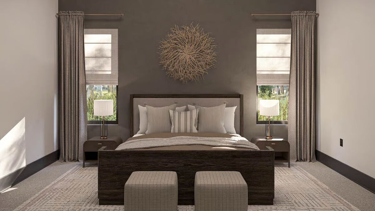 The private master suite serves as a retreat, complete with a spa-inspired bath featuring a soaking tub, walk-in shower, dual vanities, and a large walk-in closet.