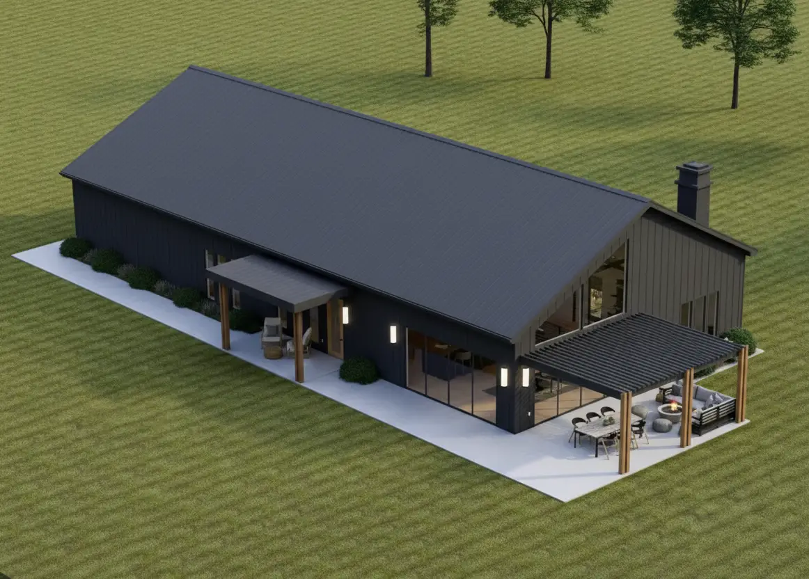 Sleek and spacious, this modern barndominium offers open-concept living with a striking black exterior and inviting outdoor entertaining areas.