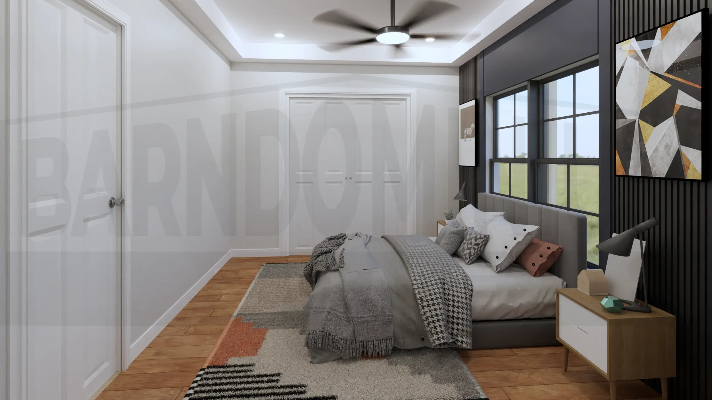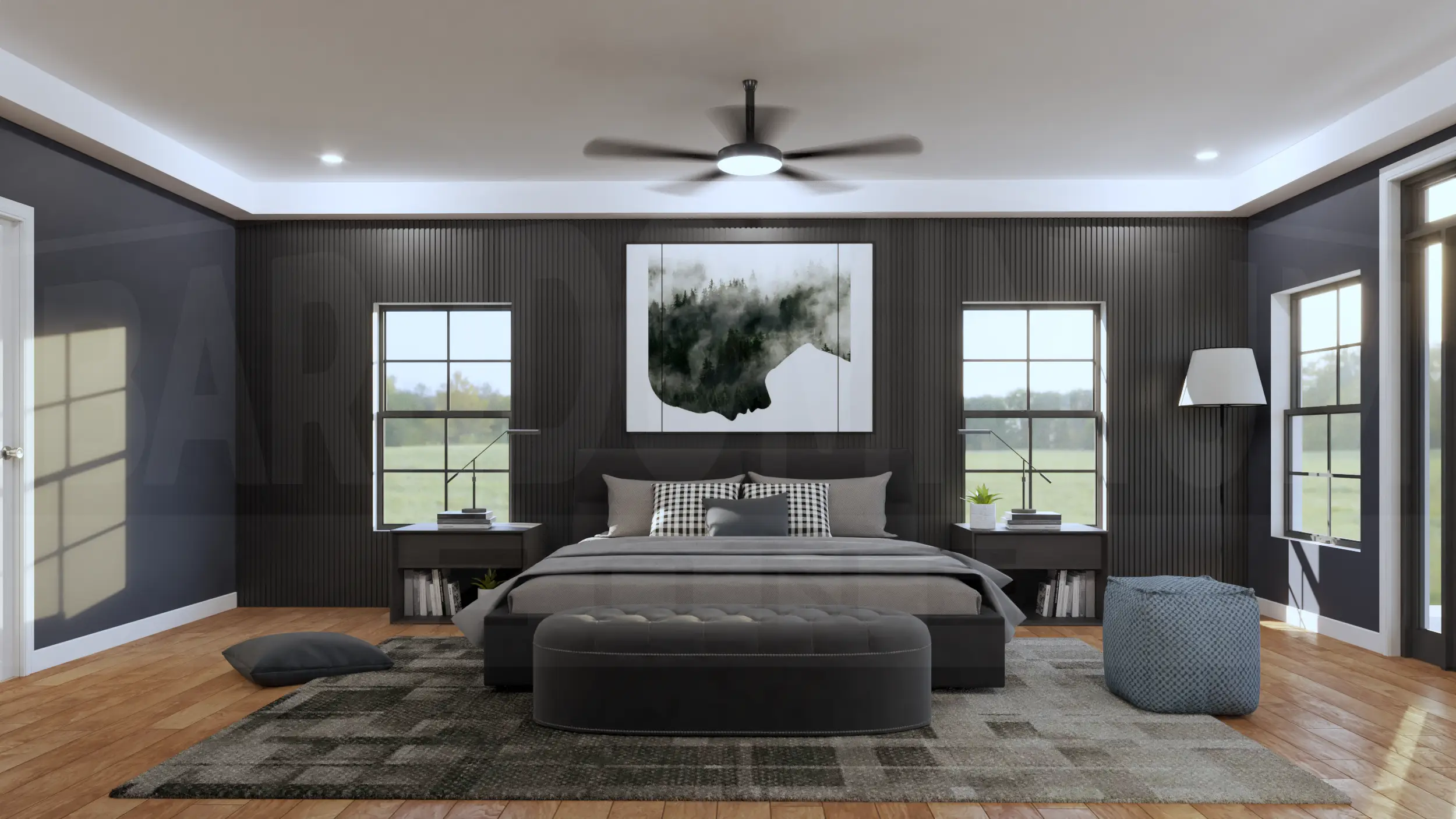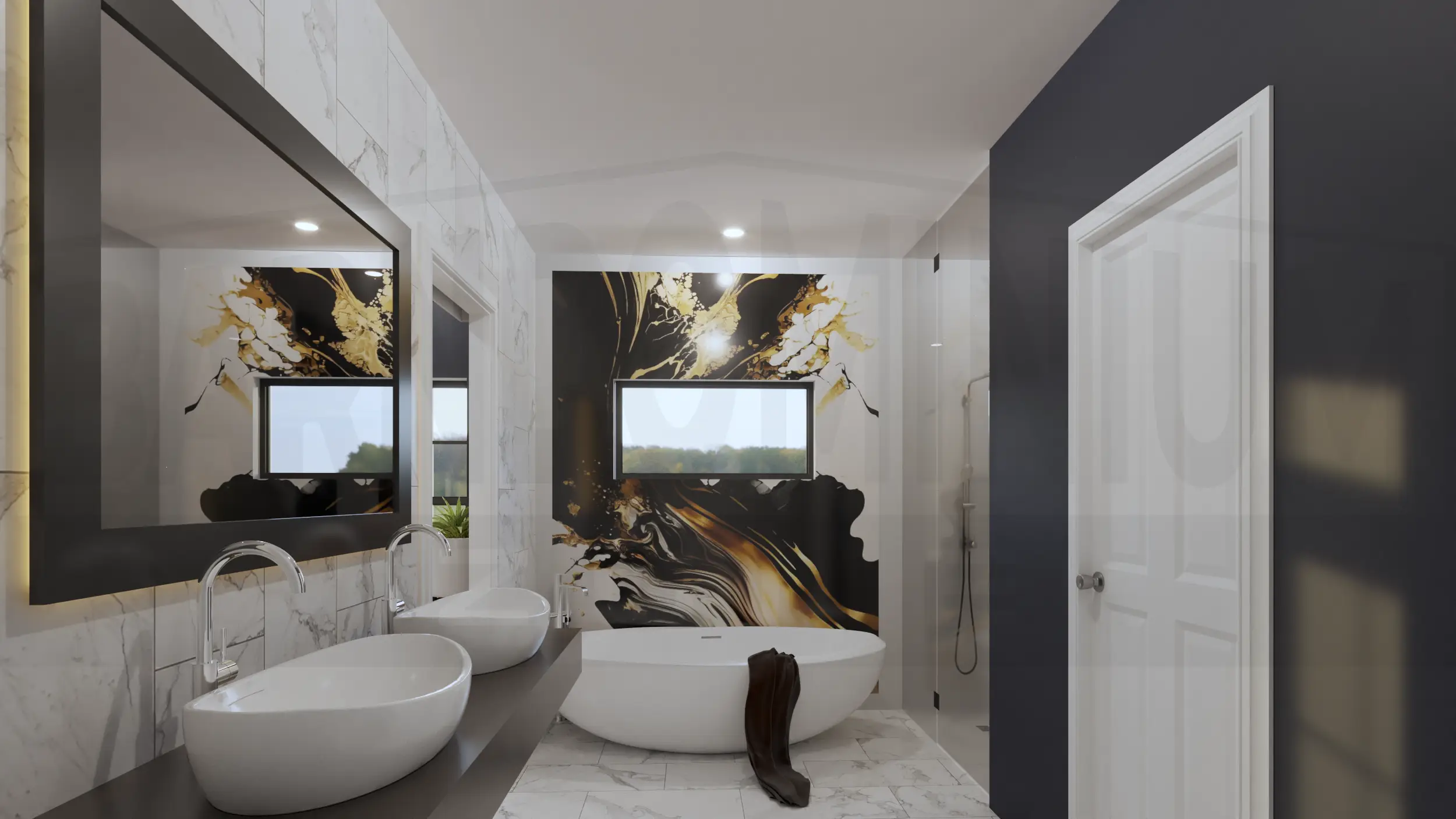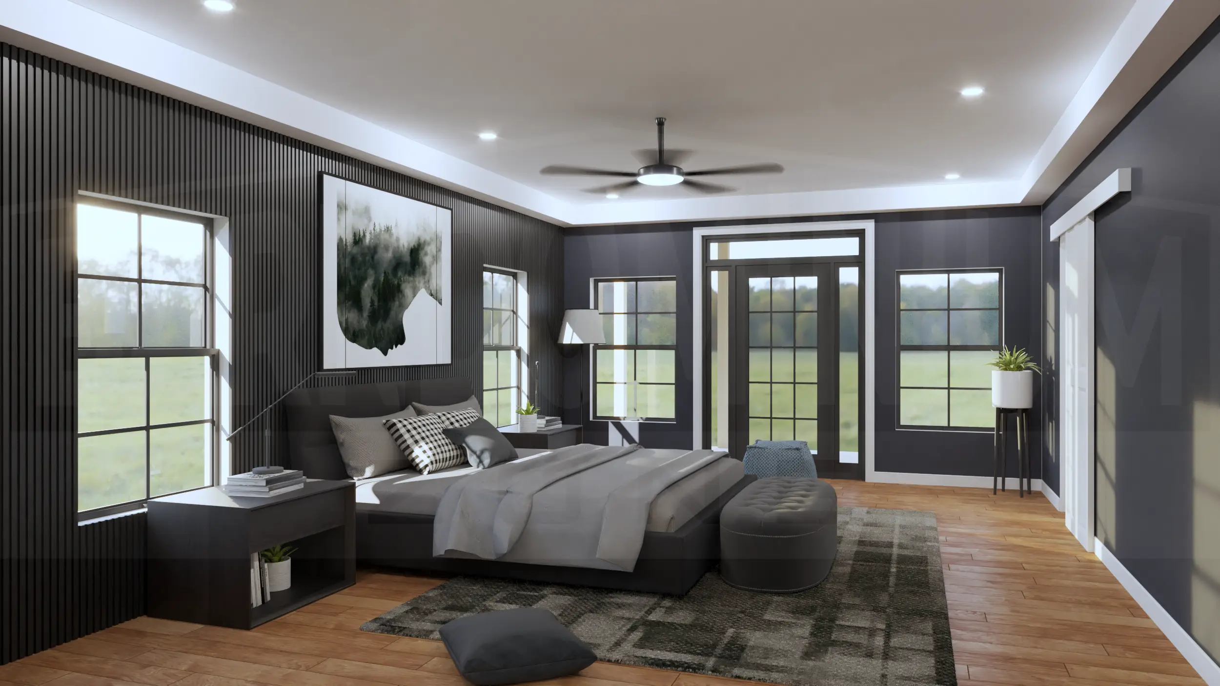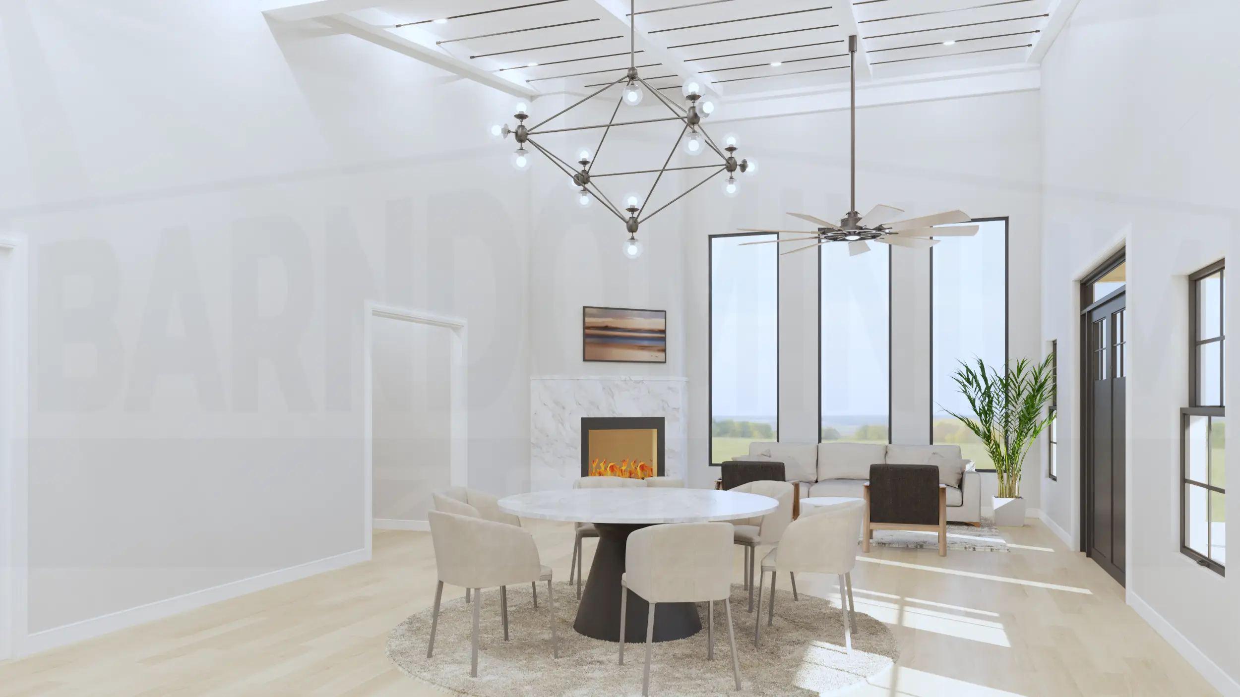 Inside, the living room combines modern comfort with rustic charm, featuring a stunning marble fireplace, floor-to-ceiling windows, and an open layout perfect for contemporary living.The open-concept living and dining area features soaring ceilings with exposed beams, a striking geometric chandelier, and seamless flow between spaces anchored by the elegant marble fireplace.The sleek kitchen features dramatic dark cabinetry with marble countertops and backsplash, complemented by a cozy breakfast nook with exposed beam ceiling details.The master bedroom creates a sophisticated retreat with dramatic dark accent walls, warm hardwood floors, and abundant natural light from symmetrically placed windows.The master bedroom showcases its spacious layout with floor-to-ceiling windows and French doors that open to outdoor views, blending modern luxury with rustic barndominium charm.The master bathroom creates a spa-like retreat with luxurious marble surfaces, a dramatic black and gold accent wall, dual vessel sinks, and a stunning freestanding soaking tub.The luxurious master bathroom features elegant marble-look tile, a spacious walk-in shower, and a stunning soaking tub with modern fixtures.This spacious bedroom combines modern comfort with rustic charm, featuring a tray ceiling with ceiling fan, large windows with countryside views, and ample built-in storage.The Meadway’s second bedroom showcases contemporary design with a statement accent wall, large windows for natural light, and generous closet space.The third bedroom features a striking dark accent wall with vertical paneling, expansive windows overlooking the countryside, and plenty of built-in storage space.This elegant bathroom showcases a dramatic marble feature wall, floating vanity with vessel sink, and modern fixtures that blend luxury with contemporary design.The stunning powder room features a bold artistic marble statement wall with gold accents, sleek floating vanity, and sophisticated lighting that creates a luxurious guest experience.The functional mudroom and laundry area combines style and practicality with built-in storage benches, coat hooks, and side-by-side washer and dryer units perfect for busy family life.The Meadway’s spacious two-car garage features a dramatic black accent wall, exposed beam ceiling, and ample workshop space perfect for hobbies and storage.The Meadway floor plan Buy This Plan