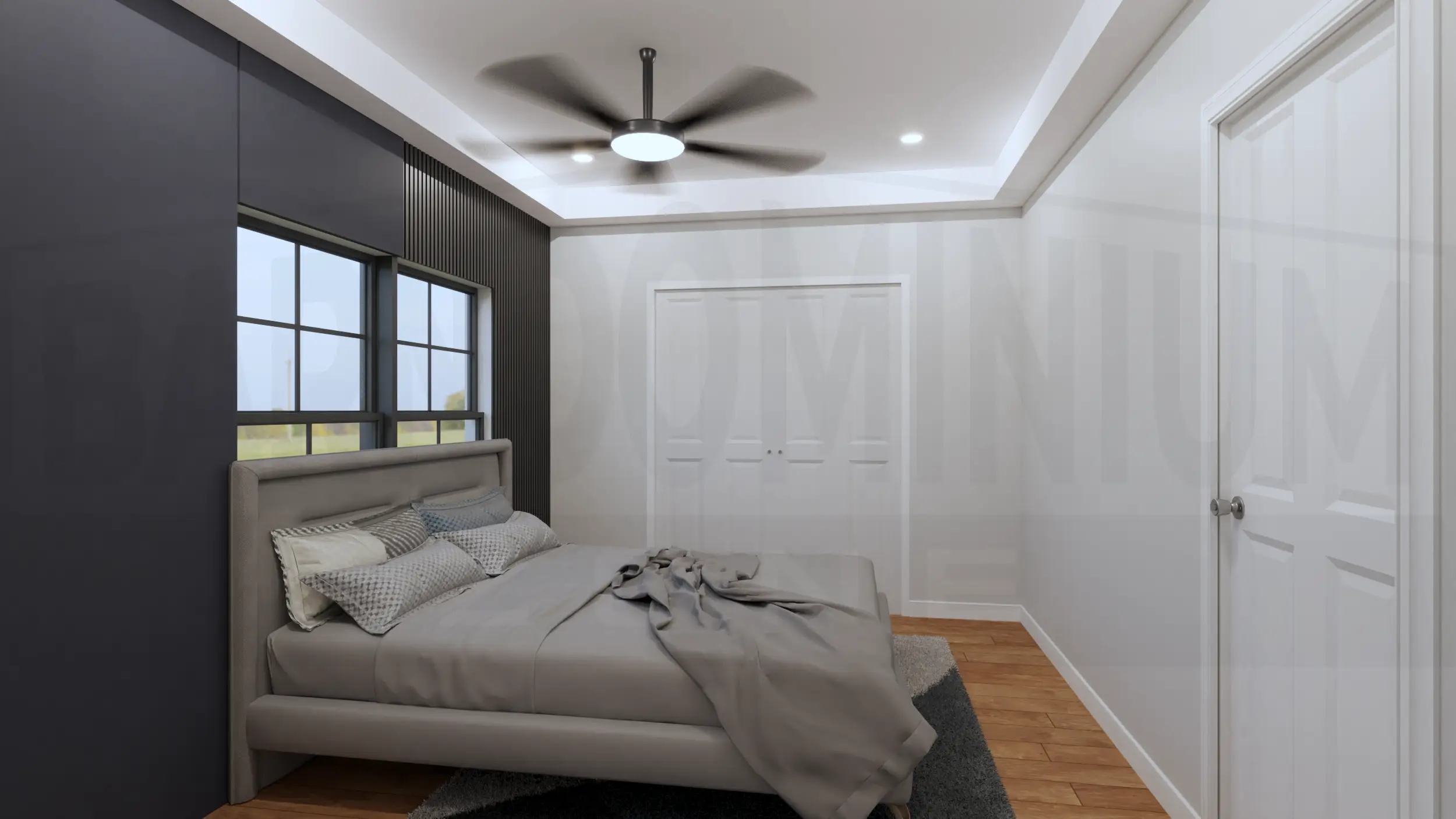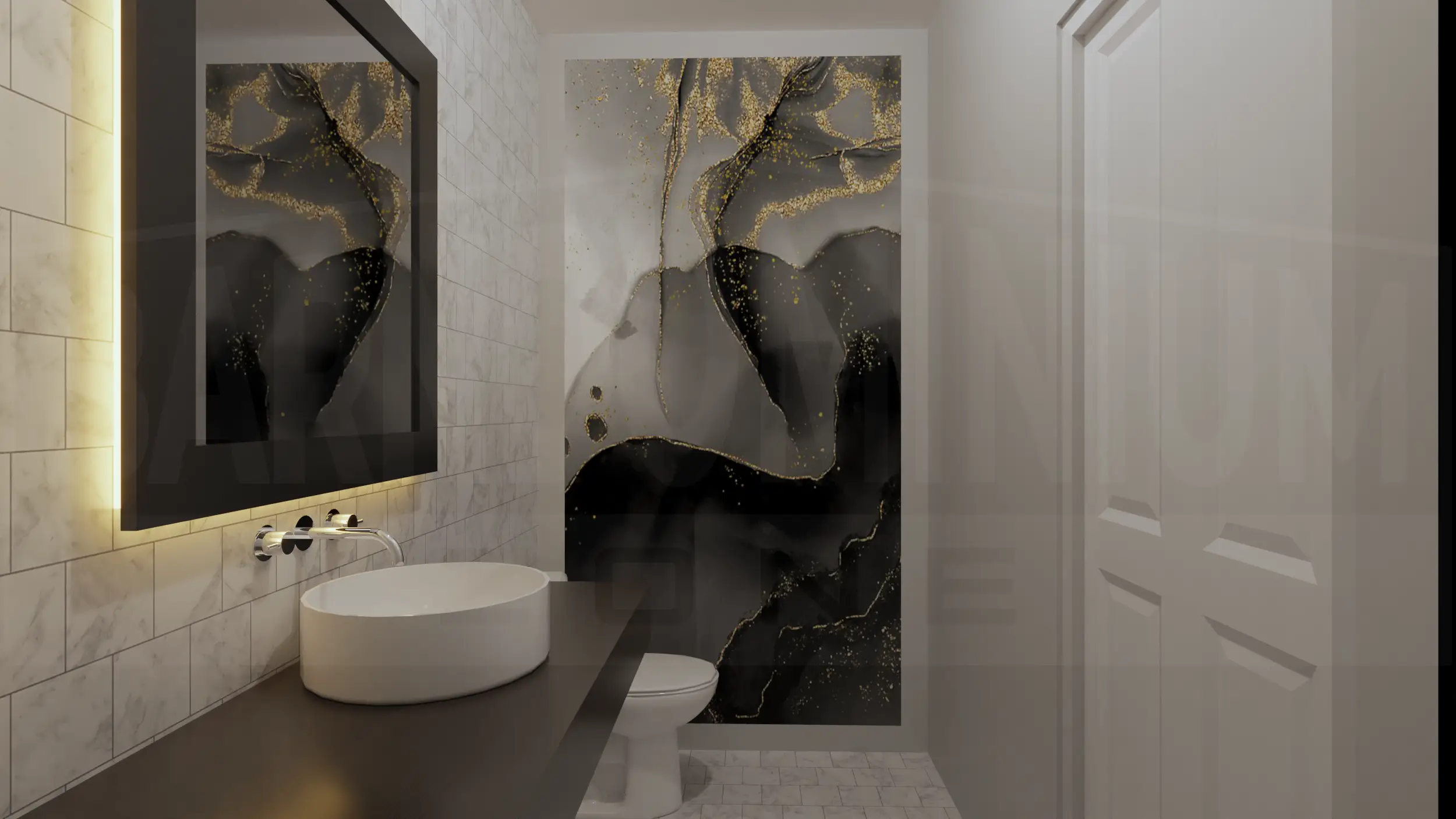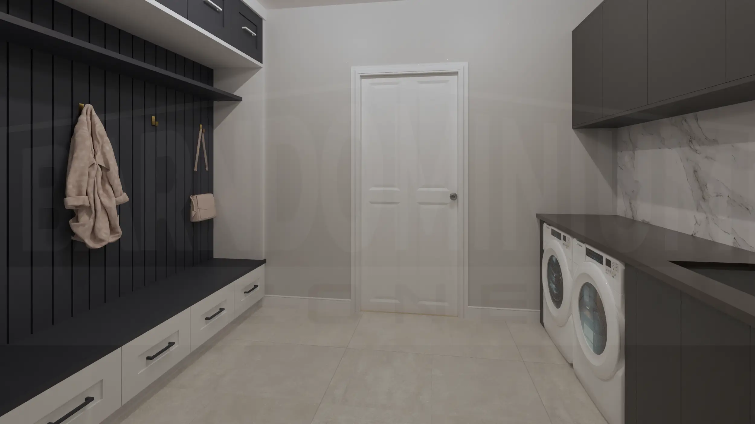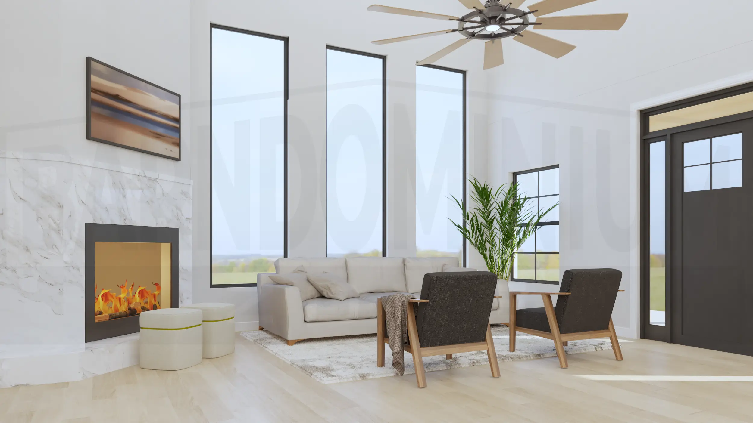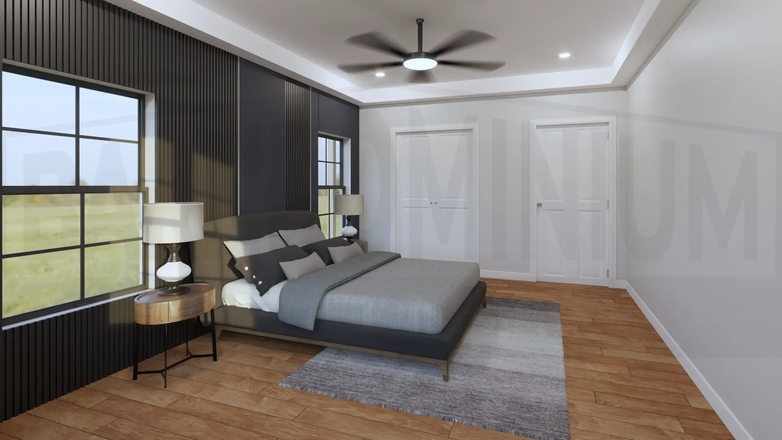 Inside, the living room combines modern comfort with rustic charm, featuring a stunning marble fireplace, floor-to-ceiling windows, and an open layout perfect for contemporary living.The open-concept living and dining area features soaring ceilings with exposed beams, a striking geometric chandelier, and seamless flow between spaces anchored by the elegant marble fireplace.The sleek kitchen features dramatic dark cabinetry with marble countertops and backsplash, complemented by a cozy breakfast nook with exposed beam ceiling details.The master bedroom creates a sophisticated retreat with dramatic dark accent walls, warm hardwood floors, and abundant natural light from symmetrically placed windows.The master bedroom showcases its spacious layout with floor-to-ceiling windows and French doors that open to outdoor views, blending modern luxury with rustic barndominium charm.The master bathroom creates a spa-like retreat with luxurious marble surfaces, a dramatic black and gold accent wall, dual vessel sinks, and a stunning freestanding soaking tub.The luxurious master bathroom features elegant marble-look tile, a spacious walk-in shower, and a stunning soaking tub with modern fixtures.This spacious bedroom combines modern comfort with rustic charm, featuring a tray ceiling with ceiling fan, large windows with countryside views, and ample built-in storage.The Meadway’s second bedroom showcases contemporary design with a statement accent wall, large windows for natural light, and generous closet space.The third bedroom features a striking dark accent wall with vertical paneling, expansive windows overlooking the countryside, and plenty of built-in storage space.This elegant bathroom showcases a dramatic marble feature wall, floating vanity with vessel sink, and modern fixtures that blend luxury with contemporary design.The stunning powder room features a bold artistic marble statement wall with gold accents, sleek floating vanity, and sophisticated lighting that creates a luxurious guest experience.The functional mudroom and laundry area combines style and practicality with built-in storage benches, coat hooks, and side-by-side washer and dryer units perfect for busy family life.The Meadway’s spacious two-car garage features a dramatic black accent wall, exposed beam ceiling, and ample workshop space perfect for hobbies and storage.The Meadway floor plan Buy This Plan