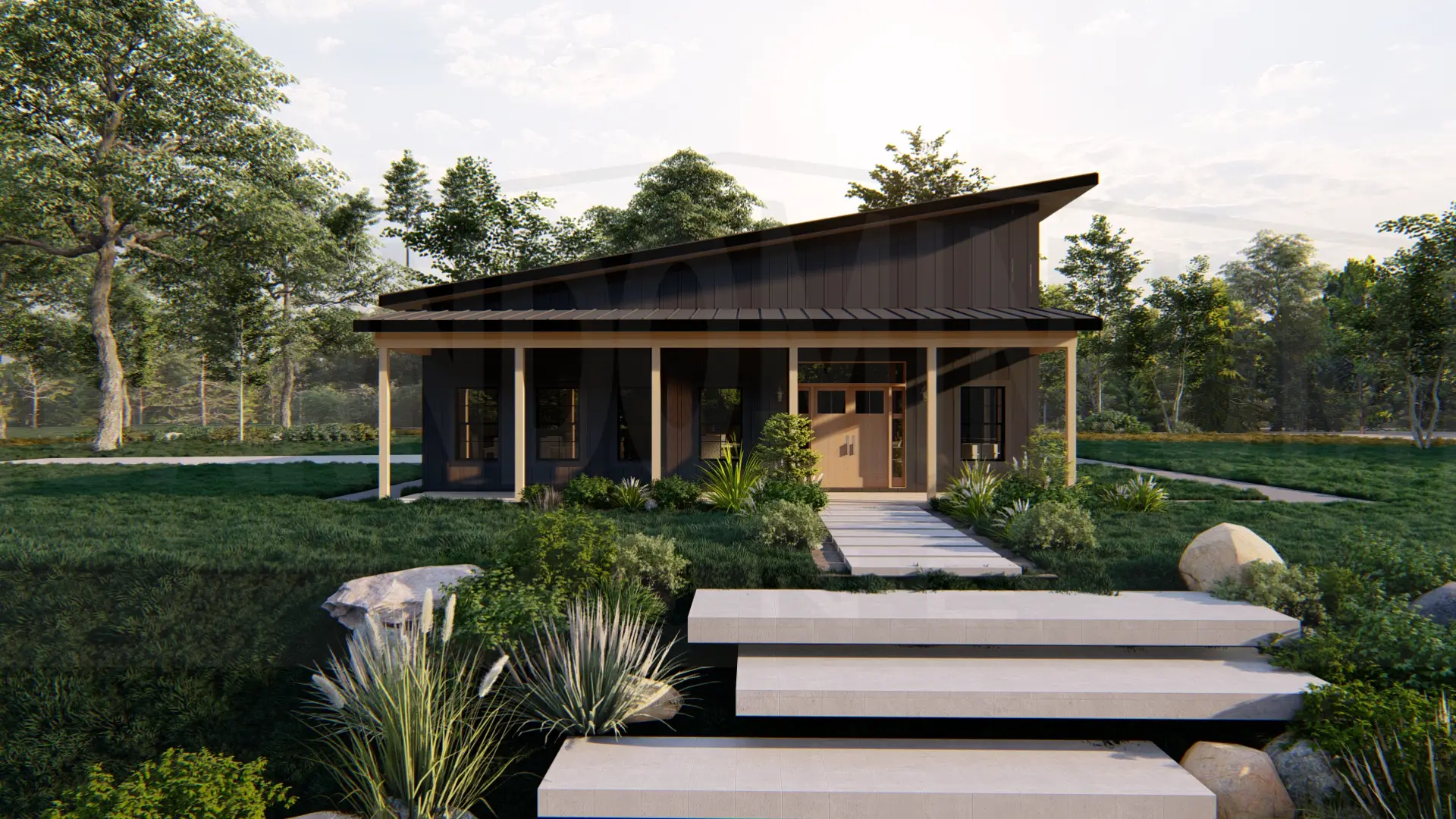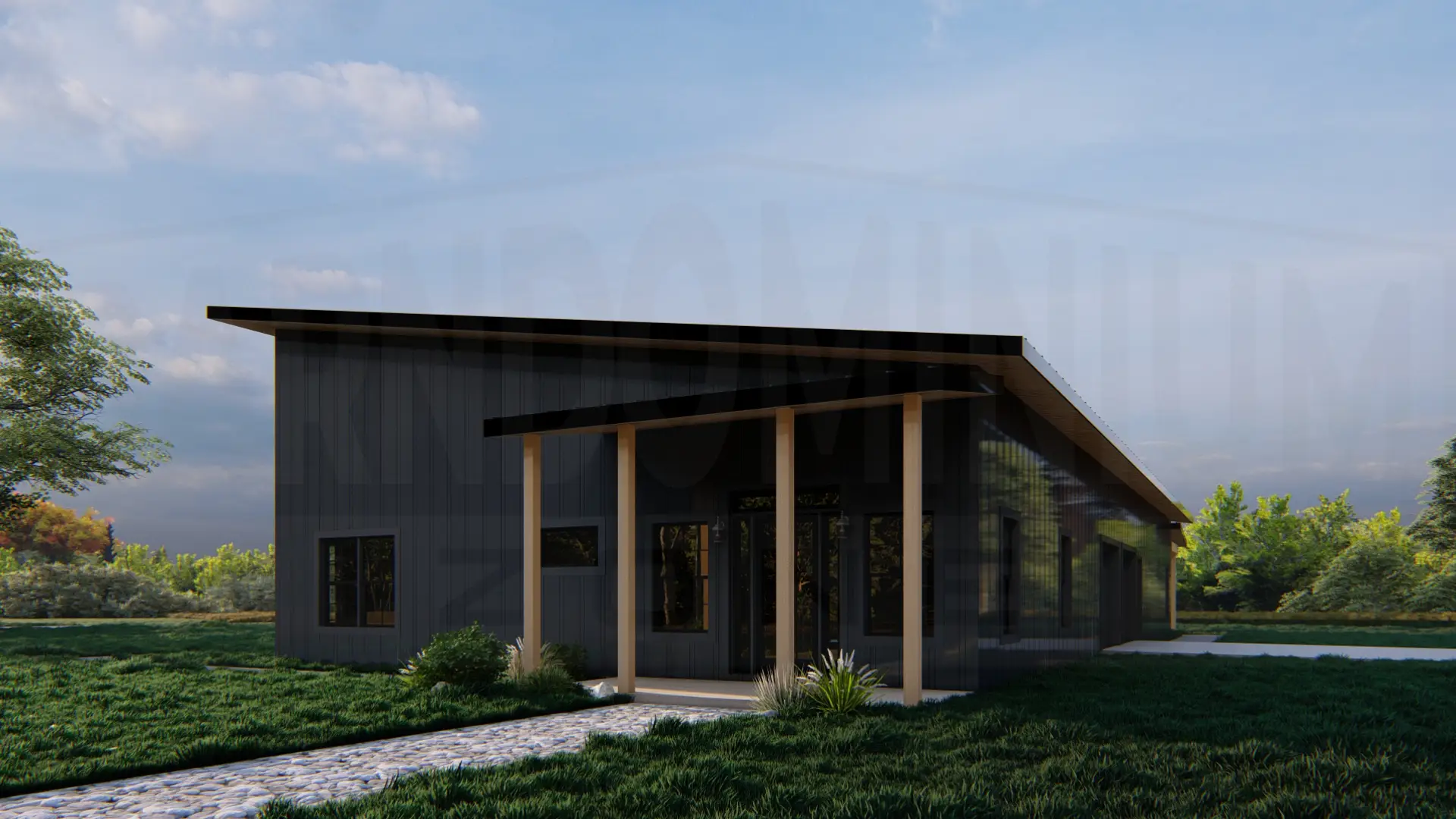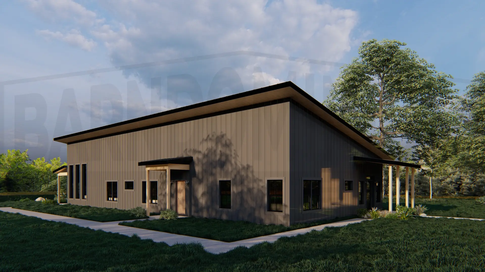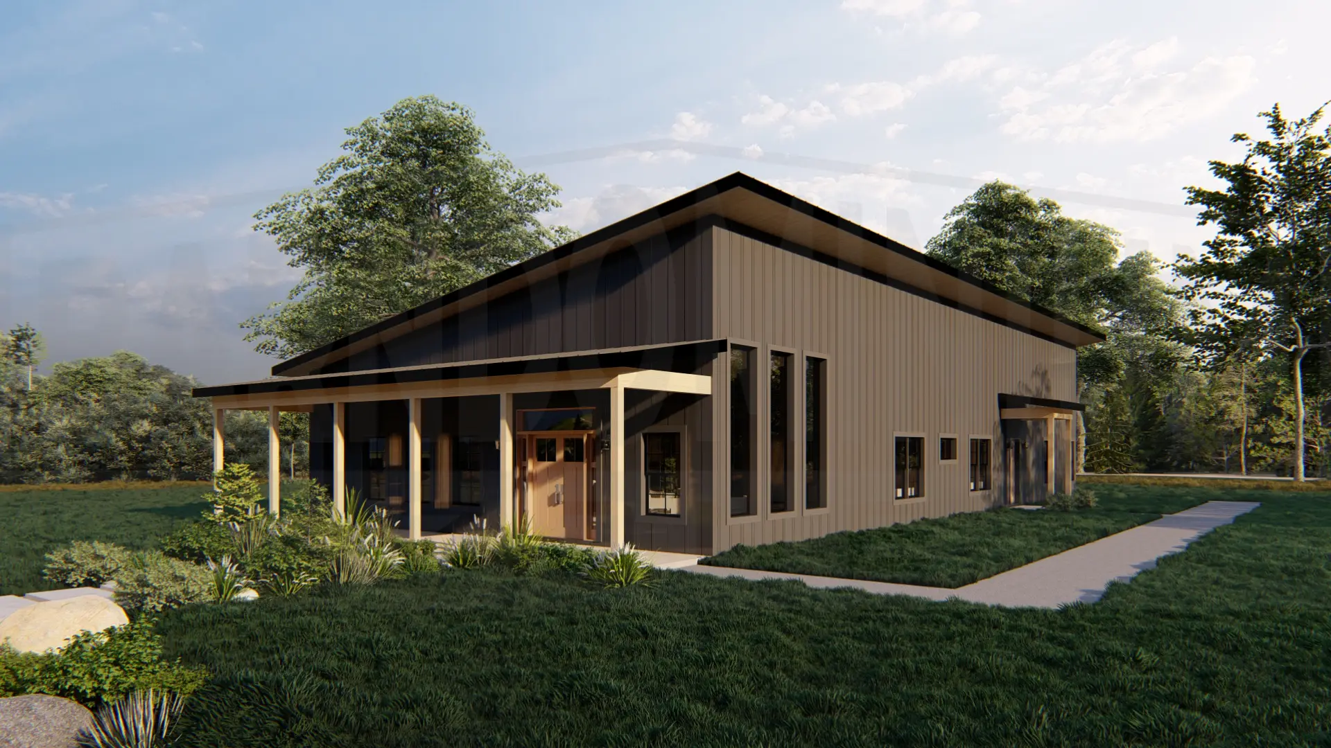 The Meadway barndominium features a sleek modern design with dark metal siding, expansive covered porch, and stunning concrete step entry surrounded by native landscaping.The Meadway barndominium showcases its clean lines and mixed metal siding from this side angle, highlighting the wraparound covered porches and abundant natural light through strategically placed windows.The rear exterior features expansive glass doors and windows that seamlessly connect indoor and outdoor living spaces beneath a generous covered patio.