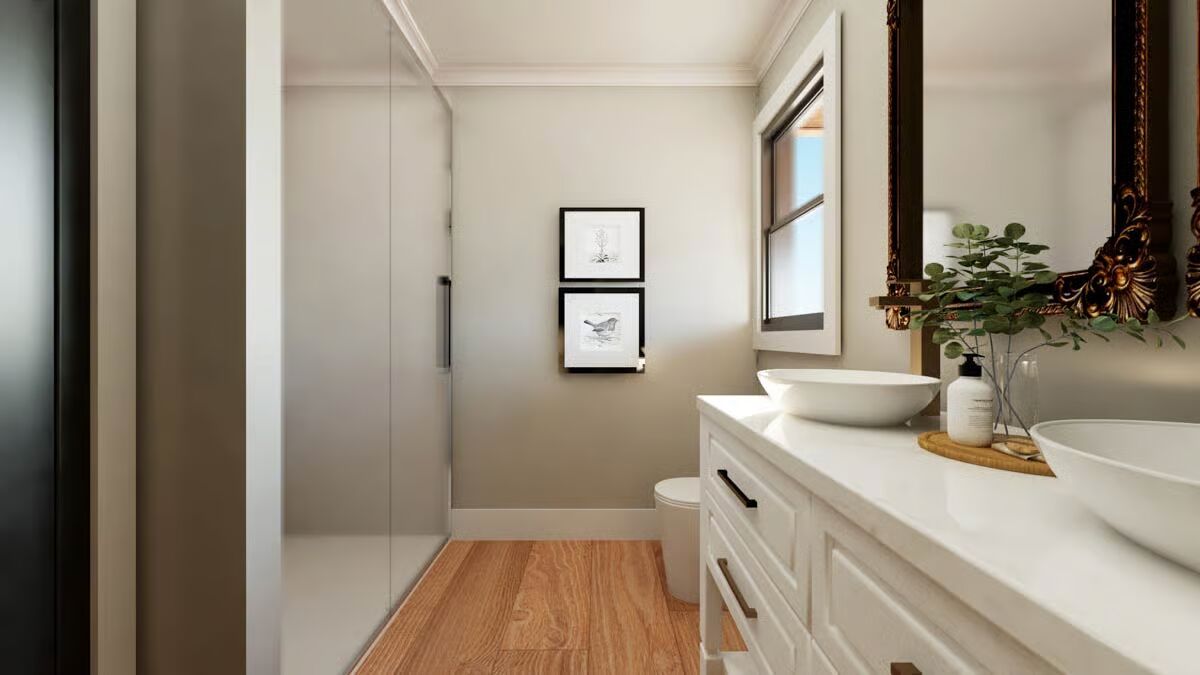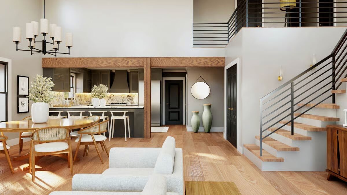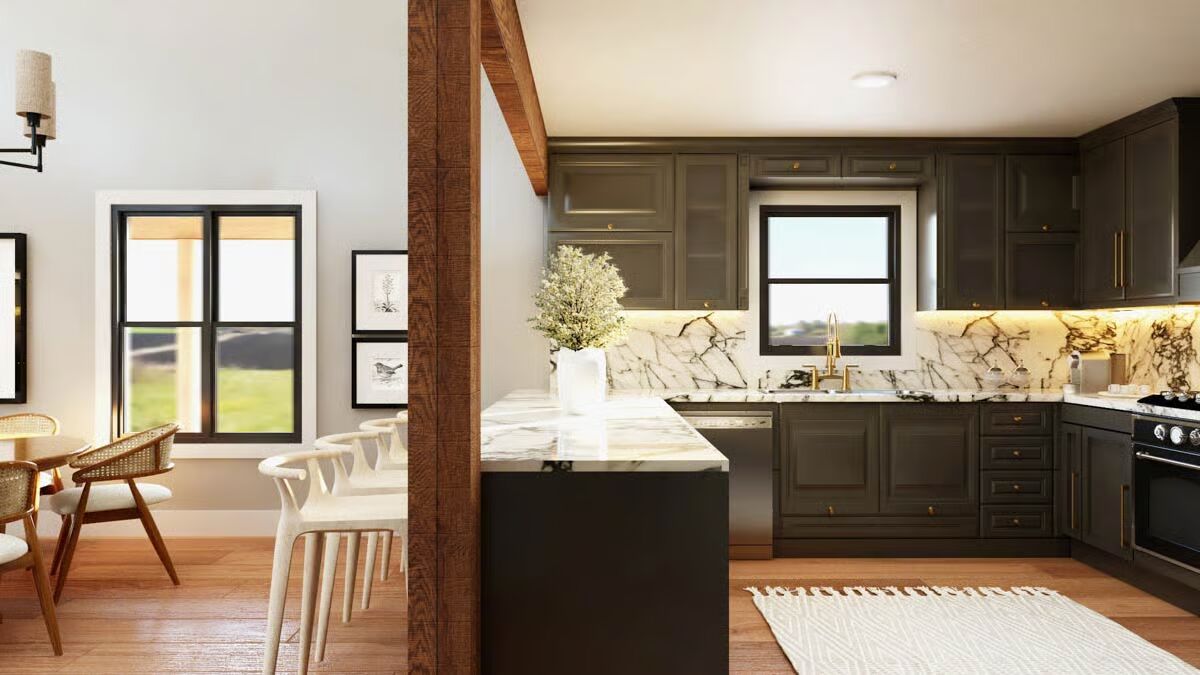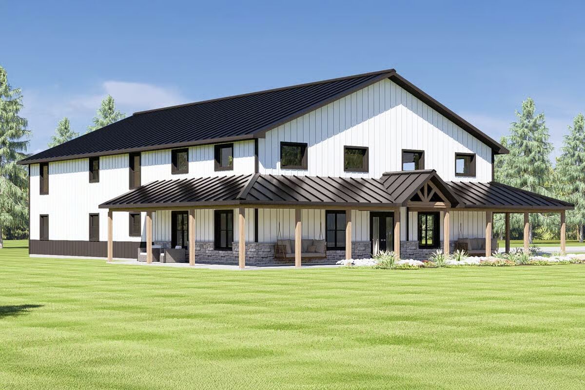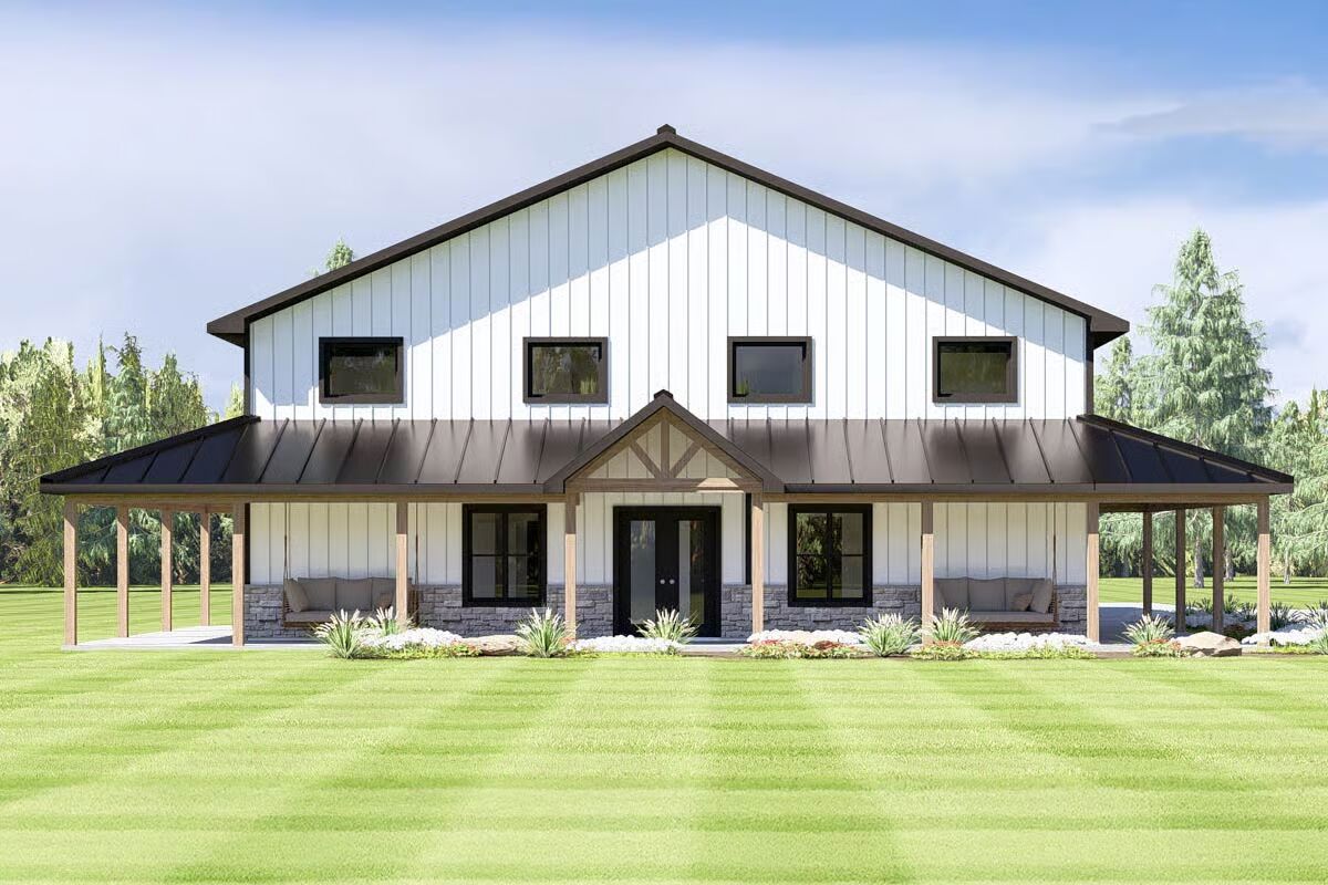 Buy This PlanThis impressive barndominium combines a classic farmhouse look with modern functionality, complete with a sweeping front porch.With its striking black and white facade, this barndominium offers a sleek design and convenient double garage doors.The side view of this barndominium highlights its extended layout and cozy side entrance, perfect for family and friends.An inviting and expansive covered porch wraps around this home, providing the ideal spot for outdoor relaxation.The symmetrical front of this barndominium creates a bold, welcoming statement with its contrasting colors and central double doors.A charming porch swing and stone accents welcome you to this stylish barndominium, blending rustic and modern elements seamlessly.Enjoy a bright and airy dining area with a high ceiling and a modern chandelier, creating the perfect space for gathering.A stunning kitchen shines with dark cabinetry, elegant marble backsplashes, and a casual bar, blending luxury with everyday living.The modern kitchen island with its sleek bar seating invites you to a casual and chic space for morning coffee or entertaining guests.The open-concept living area features a dramatic staircase and a seamless flow from the living room to the dining and kitchen spaces.Soaring ceilings and large windows fill this open living area with light, creating a grand yet comfortable space.A modern staircase with clean lines leads to a spacious loft, connecting the home’s levels with contemporary style.This cozy living room features a classic leather armchair and a sleek media console, perfect for relaxing after a long day.The upstairs loft offers a bright and versatile bonus room, complete with a comfy sofa and a gallery wall.An elegant mix of modern and traditional design elements, this space is both stylish and incredibly livable.The primary bedroom is a peaceful retreat with natural wood nightstands, a striking headboard, and a serene color palette.A minimalist bedroom design creates a tranquil sanctuary with crisp white bedding and warm, natural textures.This modern bathroom combines a clean white vanity and vessel sinks with a streamlined glass shower enclosure.The vanity area features a double sink and intricate, ornate mirrors, adding a touch of classic elegance to a modern bathroom.